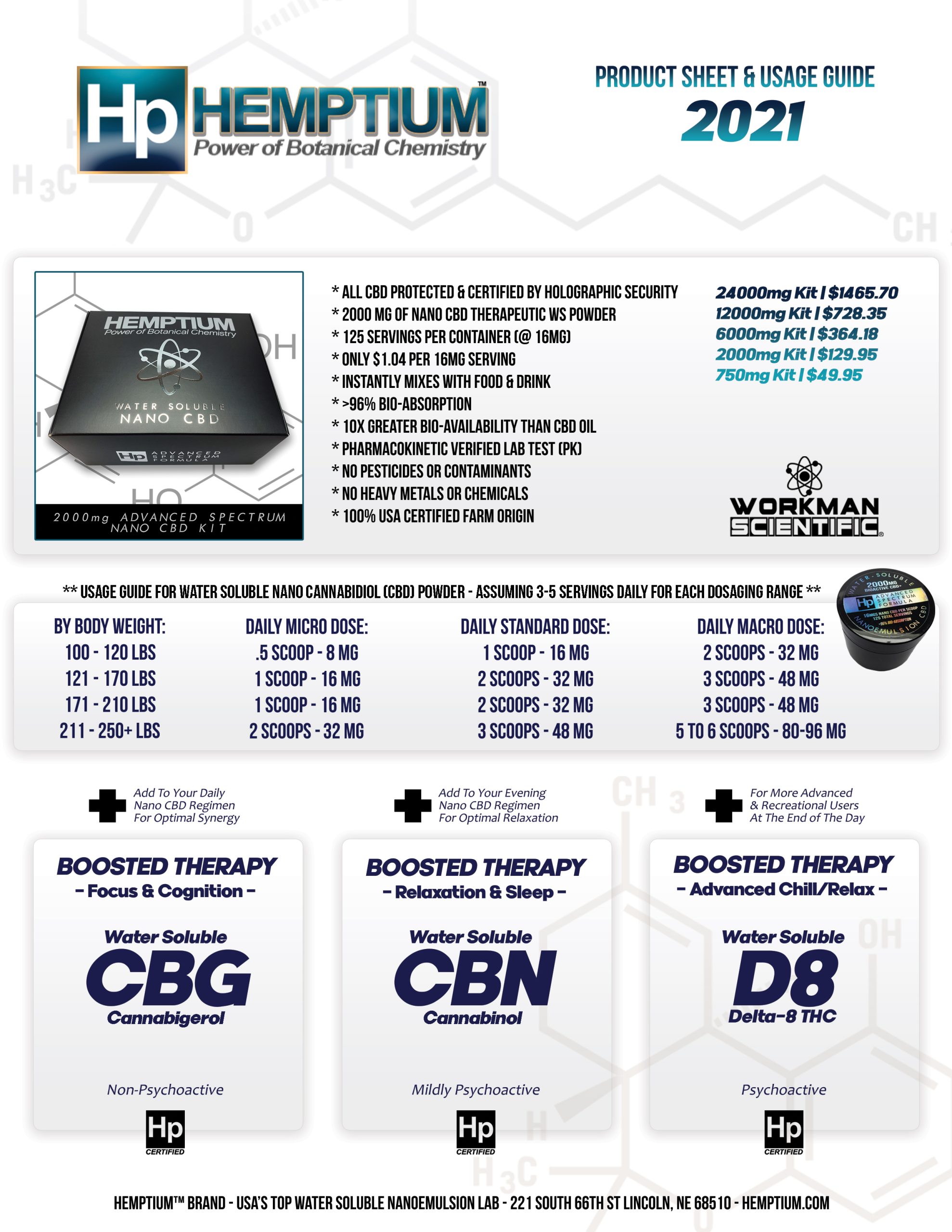 The Newest Product to join the HEMPTIUM™ CBD array, is a specially formulated Water Soluble NANOEMULSION Advanced Therapeutics Family Pack, that comes complete with six (6) 2000mg of Ultra Premium NANO CBD BioActive Powder Kits, twelve (12) 16mg calibrated micro dosing scoops and twelve (12) 60 ml reusable shot bottles. It’s proven effective, affordable, easy to use, and mixes instantly with any liquid or food prep.
